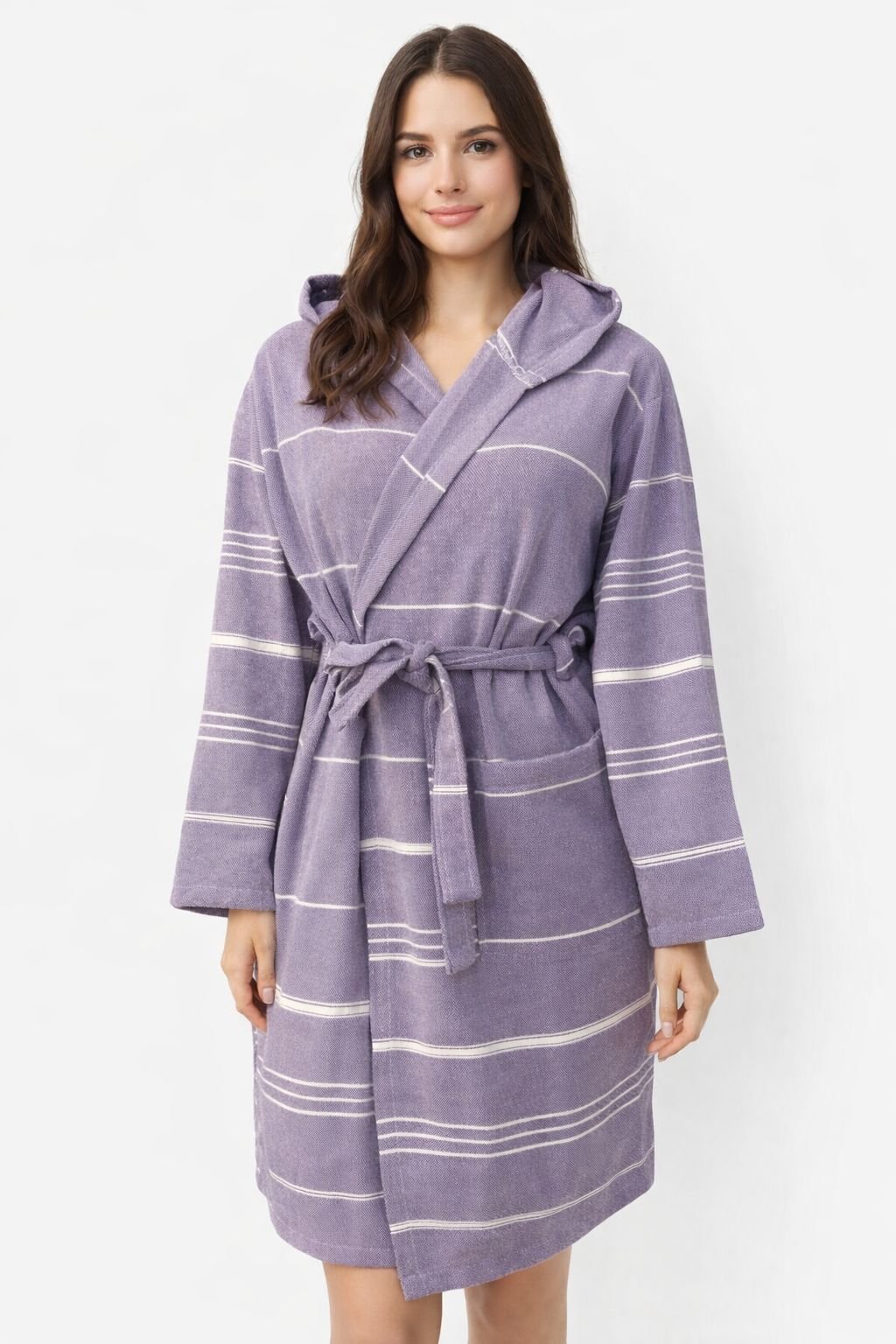 Der moderne Schnitt mit Kapuze, Gürtel und praktischen Taschen macht ihn zum kuscheligen Essential für jeden Tag. Die feinen, eingewebten Streifen verleihen ihm einen eleganten Look, der zeitlos schön ist.