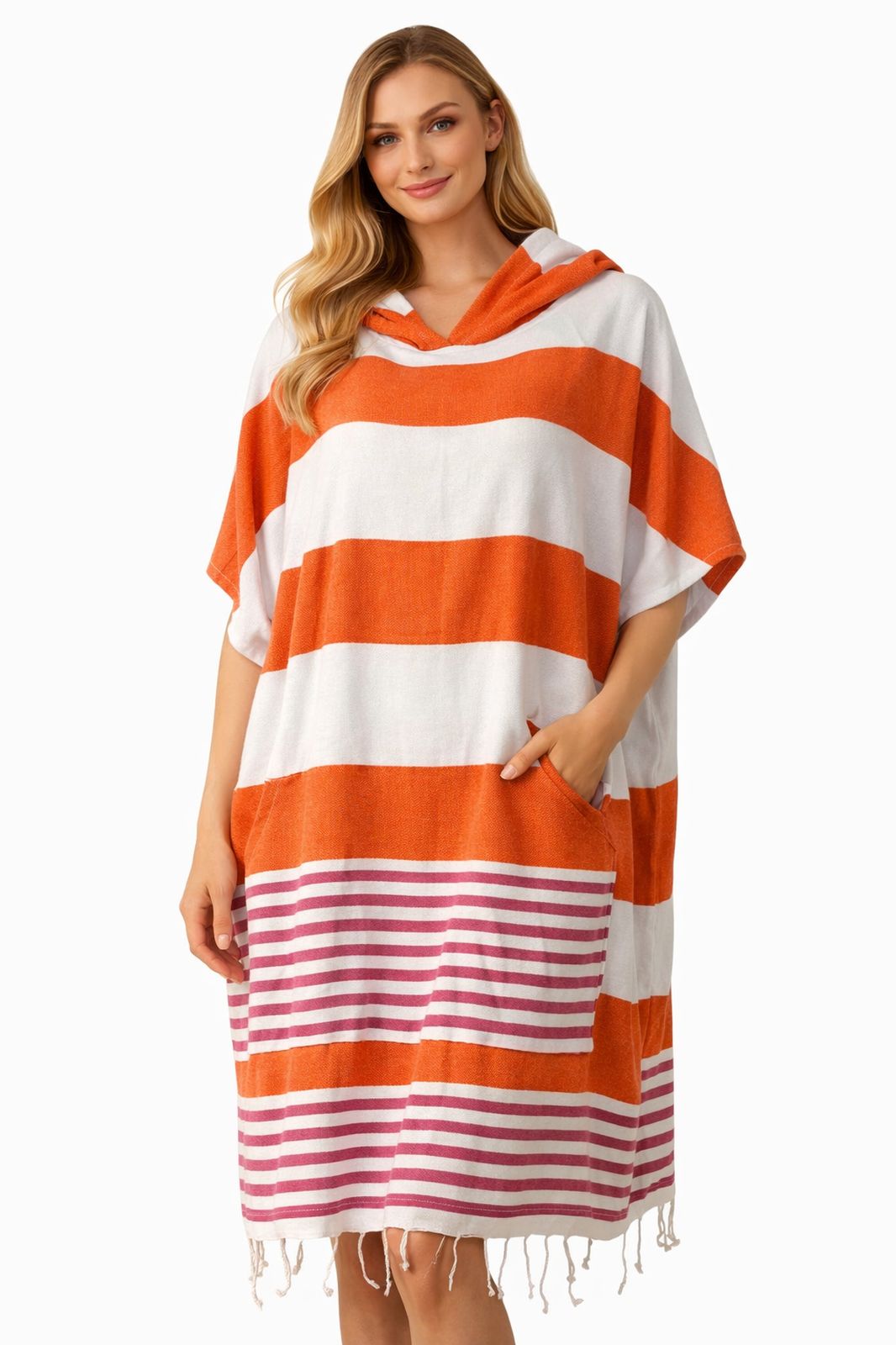 Die großen, farbigen Streifen in Orange, Weiß und Pink sorgen für einen frischen, modernen Look. Der Poncho hat eine kapuze, praktische Taschen und – typisch für DENIO – Fransen, die dem Design eine natürliche, handgefertigte Optik verleihen.